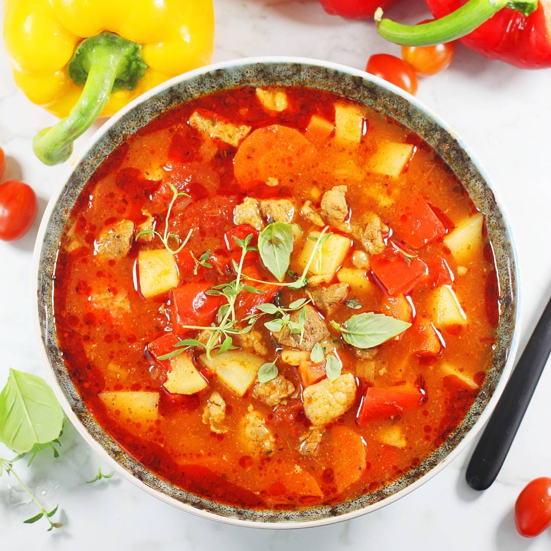 gulasz z dziczyzny, kluski kładzione, sałatka firmowa z kiszonym ogórkiem