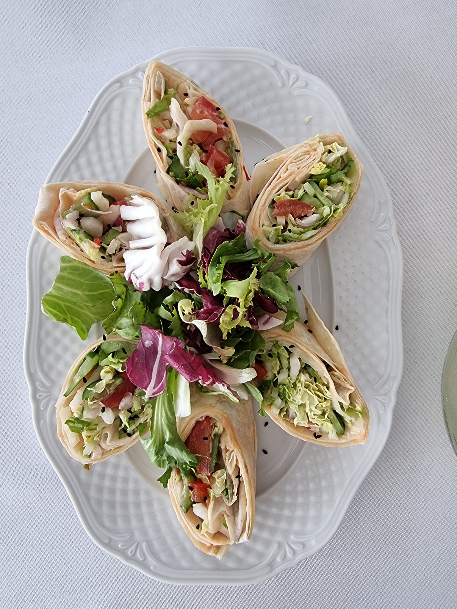 sałatka grecka (sałata lodowa, pomidor, ogórek, papryka, ser feta, oliwki czarne, czerwona cebula, sos bazyliowy)