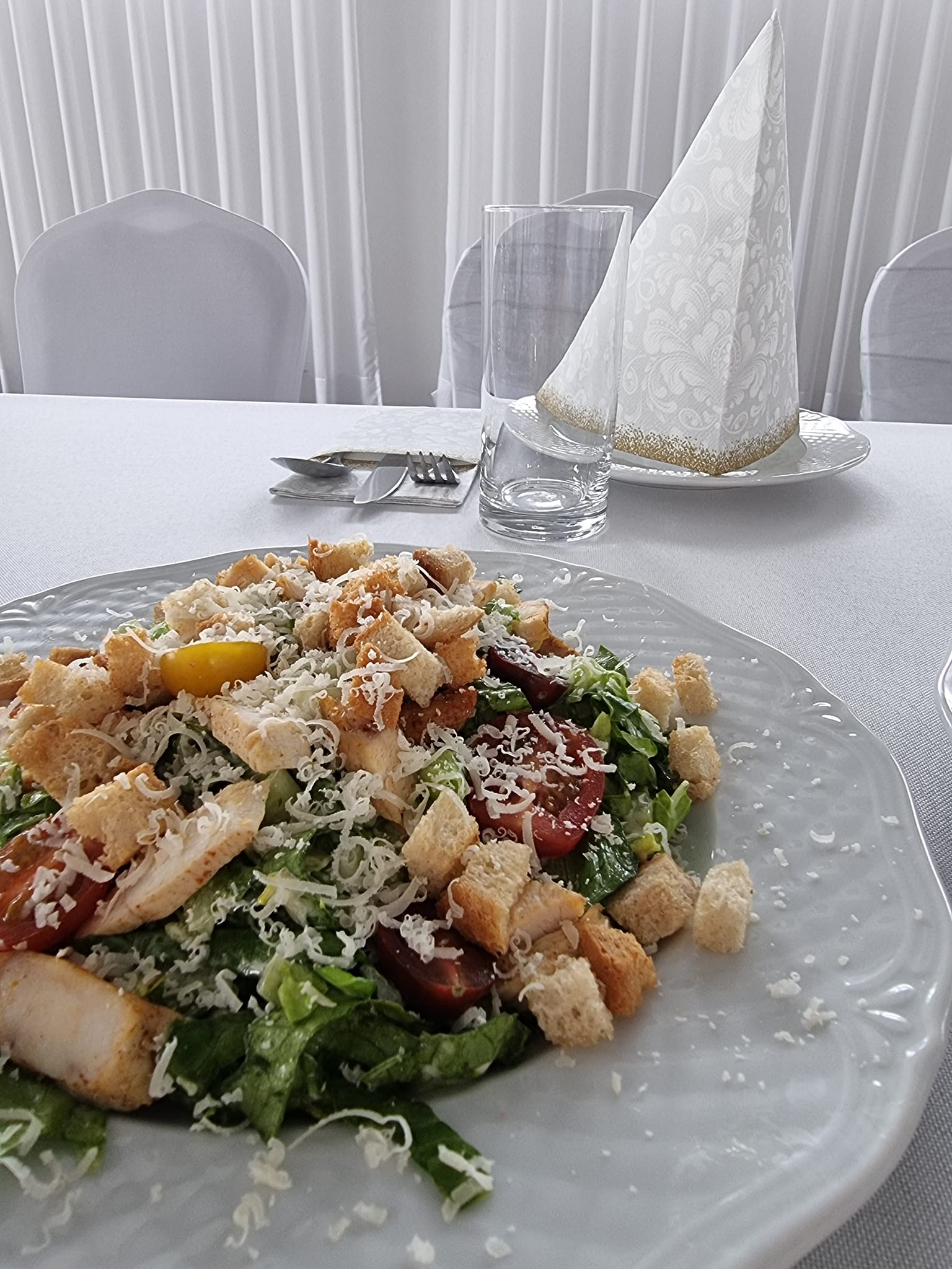 sałatka cezar (sałata mini rzymska, grillowana pierś z kurczaka, grzanki ziołowe, pomidorki cherry, parmezan, sos cesar, chips z bekonu)